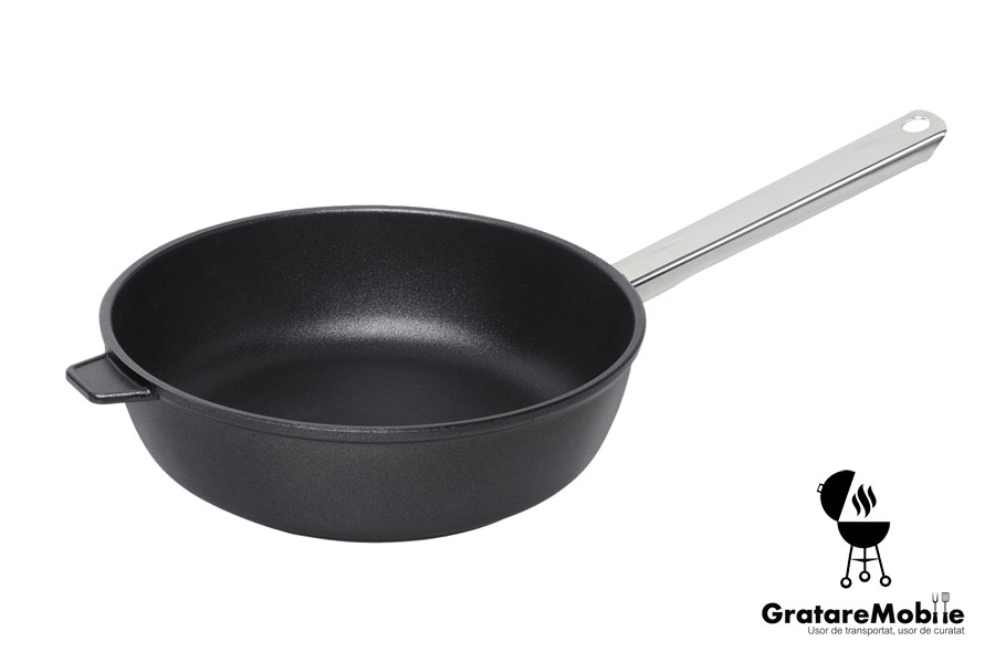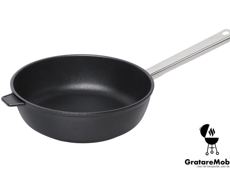 Tigaie sote profesionala,fabricata din aluminiu dur cu strat anti-lipire din titan. Potrivita pentru toate sursele de caldura, cu exceptia celor pe inductie, se incalzeste foarte repede datorita constructiei din aluminiu dur.