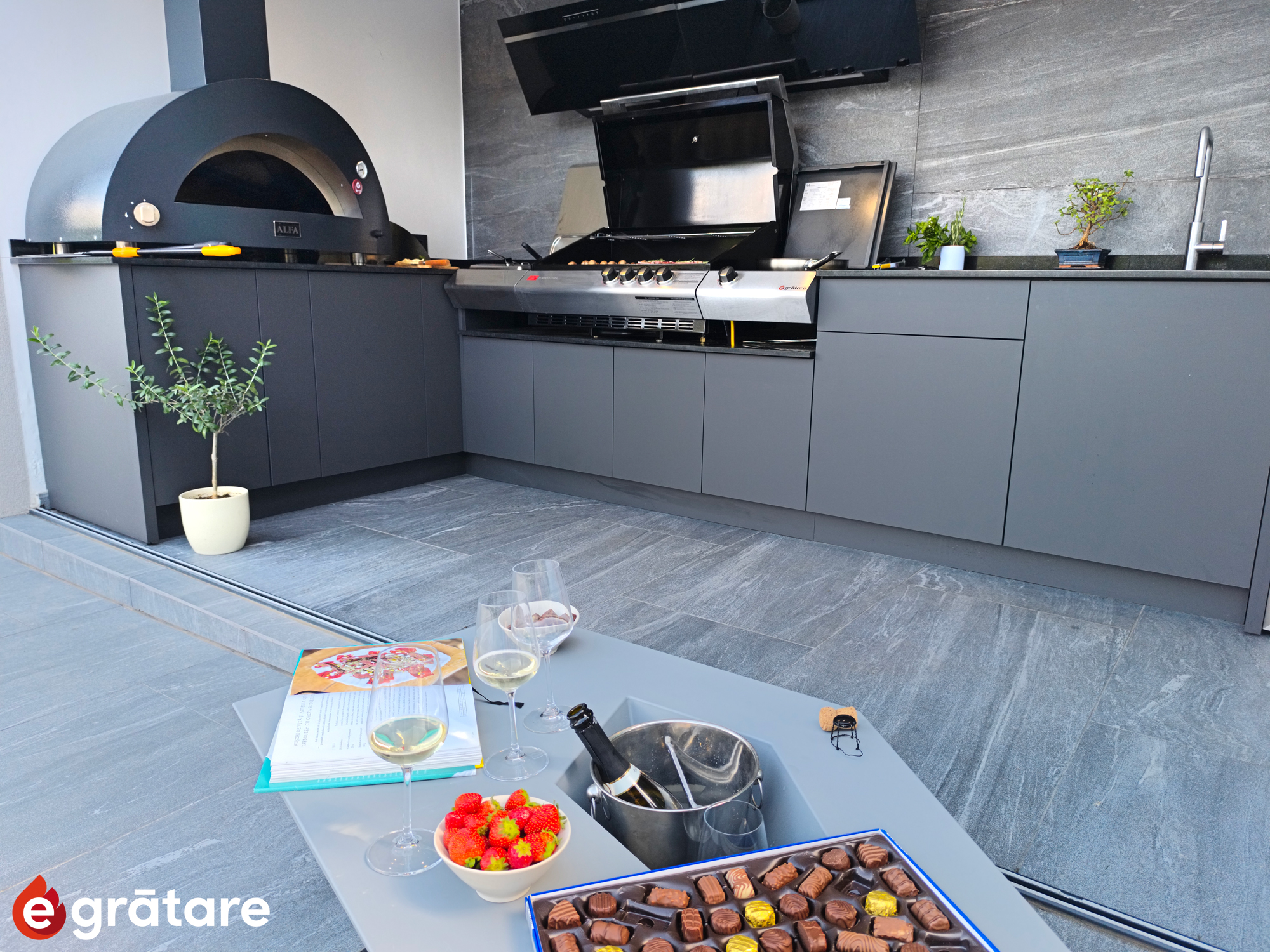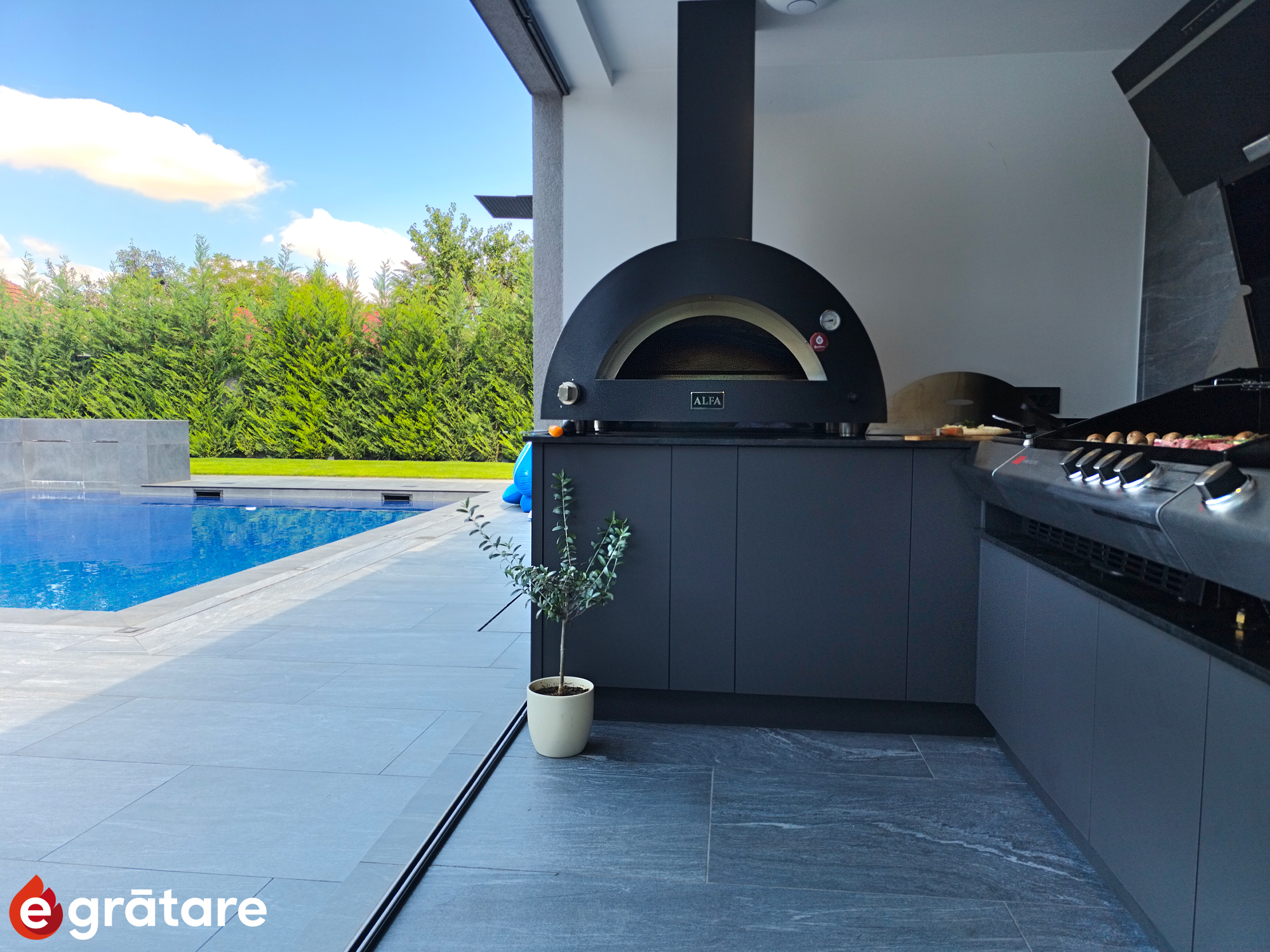 Bucatarie de vara Igloo Massimo – Bucataria de vara simpla si moderna este locul unde designul rafinat se intalneste cu functionalitatea. Creata pentru confort si inspiratie, aceasta bucatarie in aer liber combina perfect liniile curate cu utilitatea fiecarui detaliu. Este simpla in forma, dar complexa in functionalitate – un spatiu care redefineste relaxarea si gatitul in aer liber. Echipata cu un cuptor si gratar pe gaz, friteuza si ochi de aragaz, chiuveta eleganta si blat de lucru spatios, bucataria ofera libertatea de a pregati orice preparat, oricand. Frigiderul tip mini bar si spatiile de depozitare bine gandite aduc un plus de confort si ordine, transformand fiecare moment petrecut aici intr-o experienta placuta. Materialele moderne, rezistente si usor de intretinut, se imbina cu un design contemporan care adauga eleganta si stil curtii sau terasei tale. Este un spatiu creat pentru a aduna oamenii, pentru a savura gusturi, povesti si seri de neuitat in aer liber.Bucataria de vara moderna – simplitate, rafinament si bucuria gatitului sub cerul liber. Compusa din: gratar pe gaz Turbo Elite cu 4 arzatoare,doua hote, cuptor hibrid pizza Alfa Forni, friteuza electrica, ochi aragaz, blat de lucru generos, spatiu chiuveta, frigider minibar, spatii depozitare.