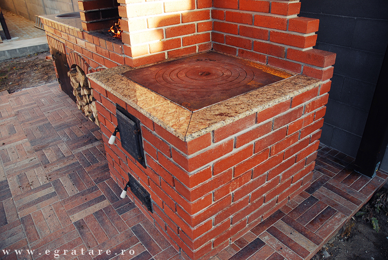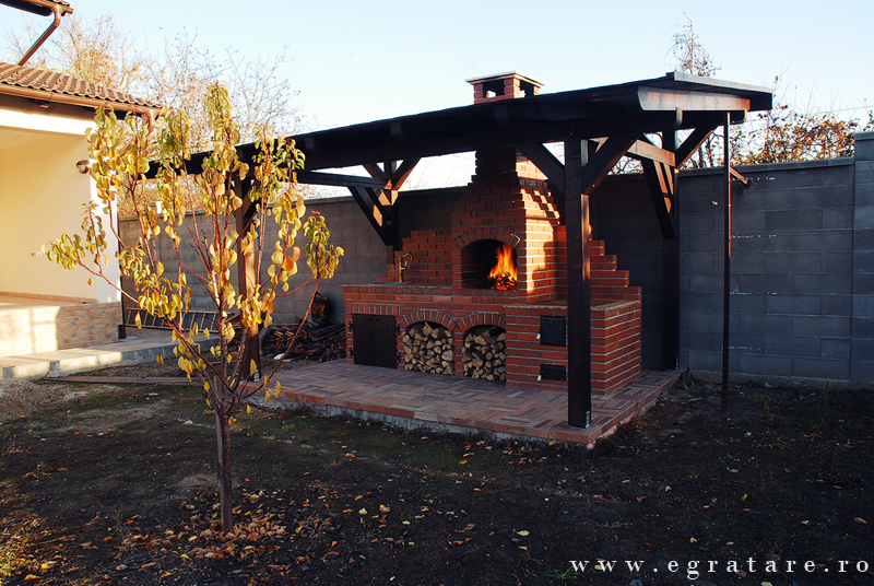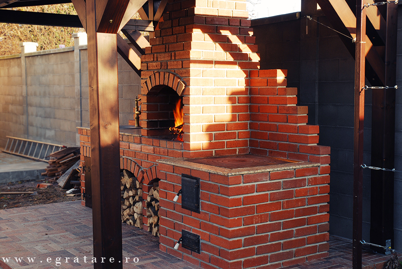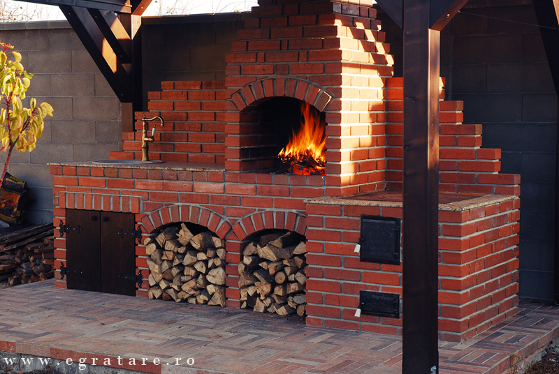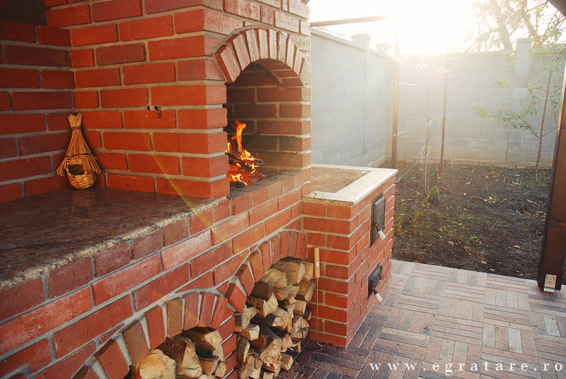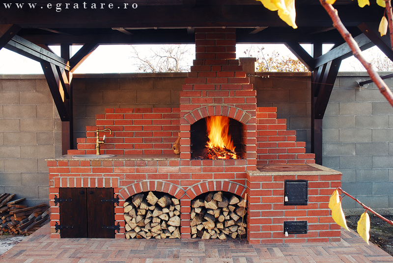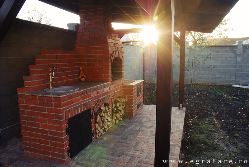 Gratar caramida Septembrie 14- Toamna este depre culoare, despre gusturi noi descoperite dar si despre aromele copilariei. O bucatarie de vara in care poti sa iti rasfeti papilele gustative cu ingrediente bine alese si gust cat mai natural: un pastrav cu cartofi pe gratar sau un bors de vita la soba cu lemne? Compusa din: gratar/rotisor actionat electric (60 x 50 cm), grill inox cu picurator , soba/plita fonta calugaresca mare, spatiu masa lucru, spatiu chiuveta cu usi personalizate, design exclusiv din caramida.
