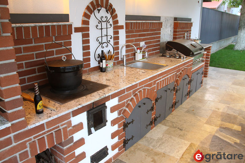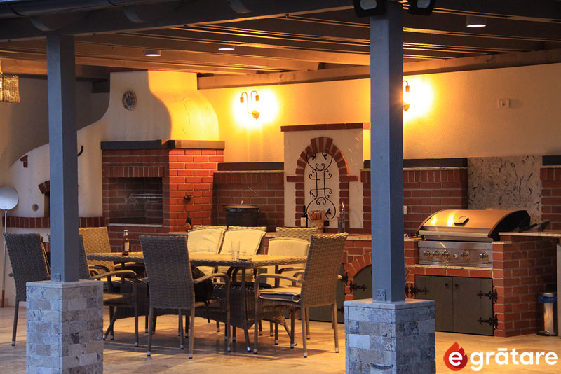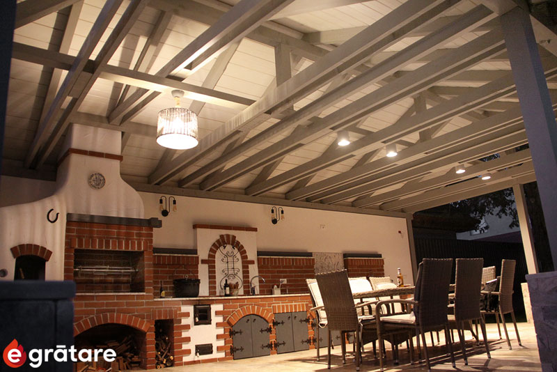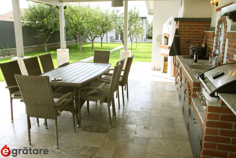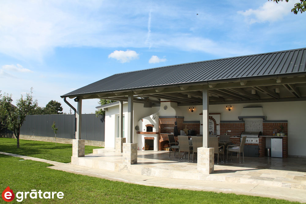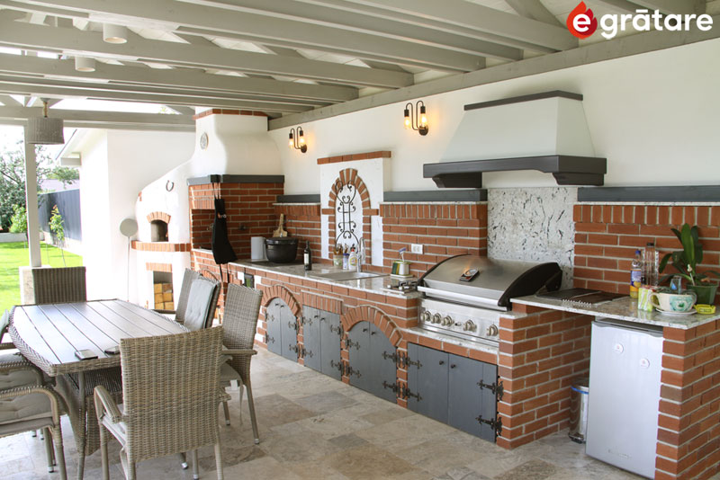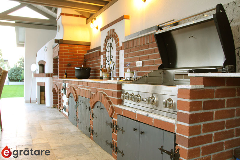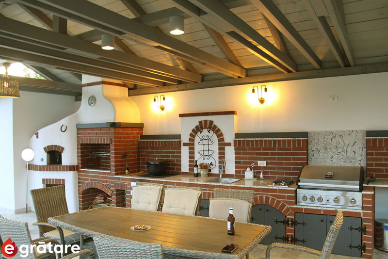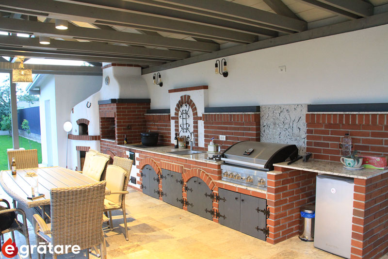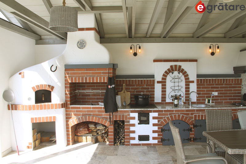 Gratar de gradina, Bucatarie de vara amenajata pe o terasa exterioara spatioasa se imbina perfect cu paleta de alb si gri al spatiului exterior.Intreaga imagine ne face sa visam la nopti de vara impreuna cu prietenii, mancare proaspta de la gratar si multa stare de bine . Bucataria in aer liber este perfecta pentru familiile carora le place sa gateasca si pretuiesc timpul petrecut impreuna.Bucataria contine: cuptor pe lemne (dimensiuni vatra diametru 72 cm), gratar/rotisor actionat electric cu sarcina de 40 kg, grill inox reglabil (dimensiuni 85x50cm) ,masa de lucru ,soba/plita fonta trei ochiuri standard, spatiu o grill pe gaz incorpotat , spatiu chiuveta cu usi lemn personalizate, masa de lucru pentru plita si chiuveta,spatiu plita pe gaz cu doua ochuri,spatiu frigider minibar, accesorii decor.