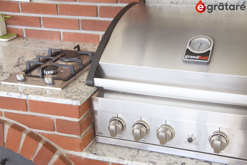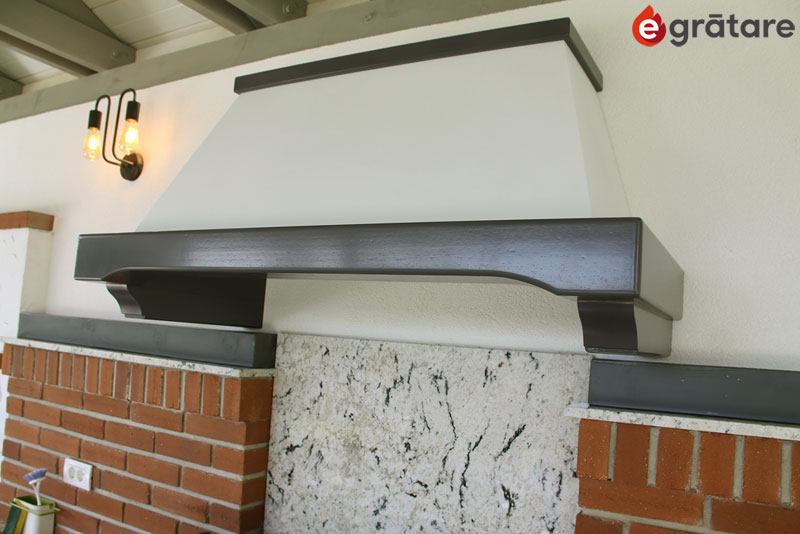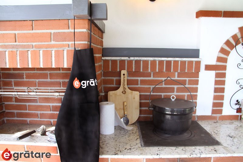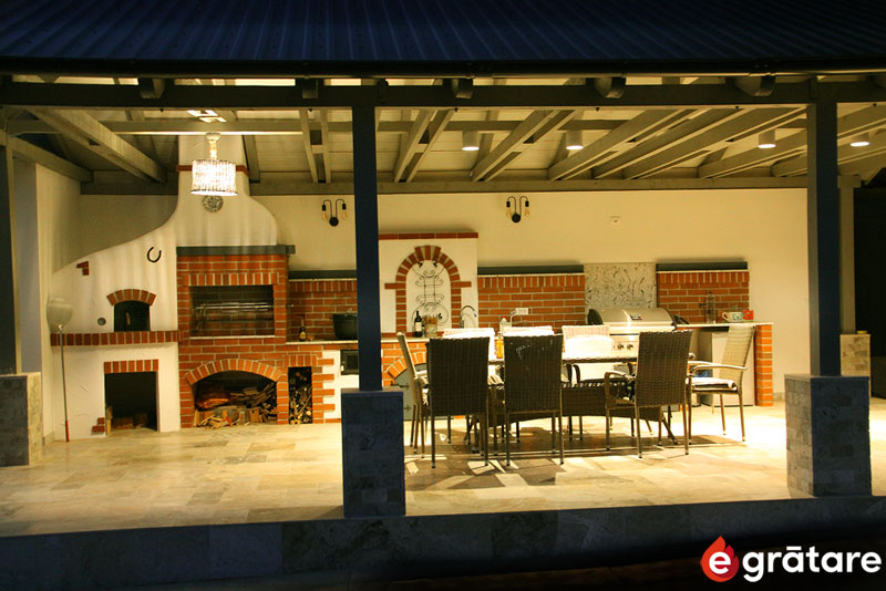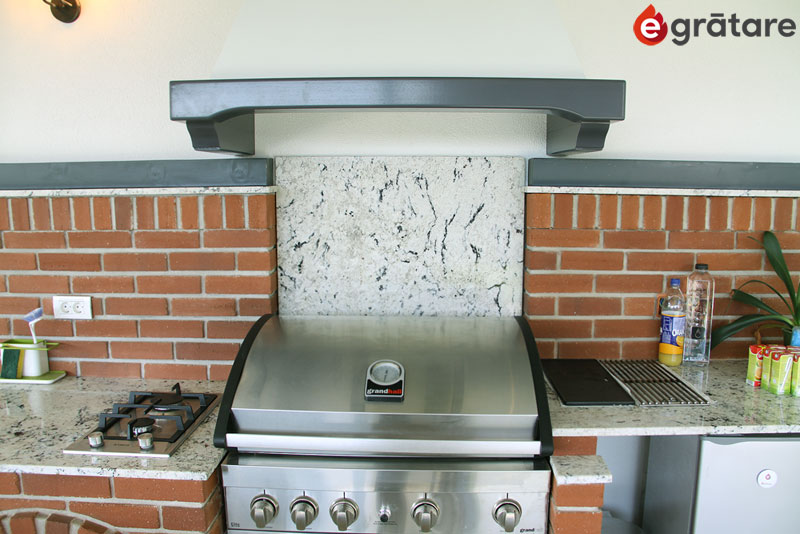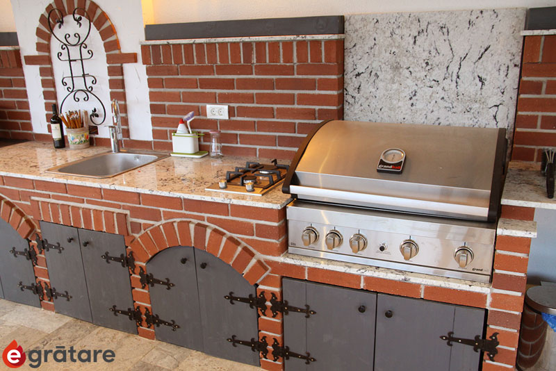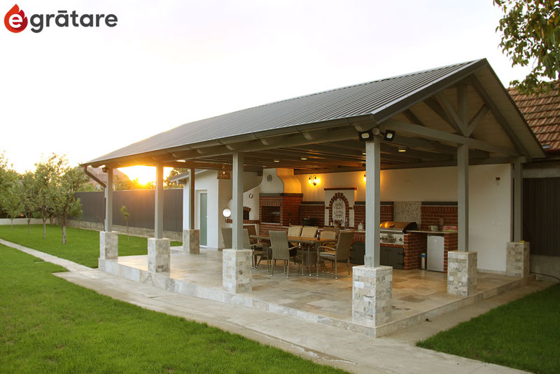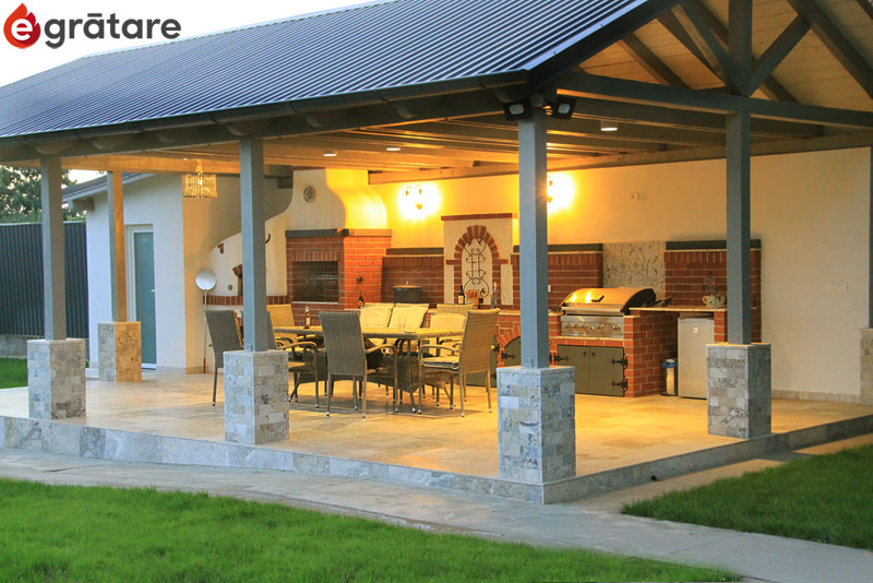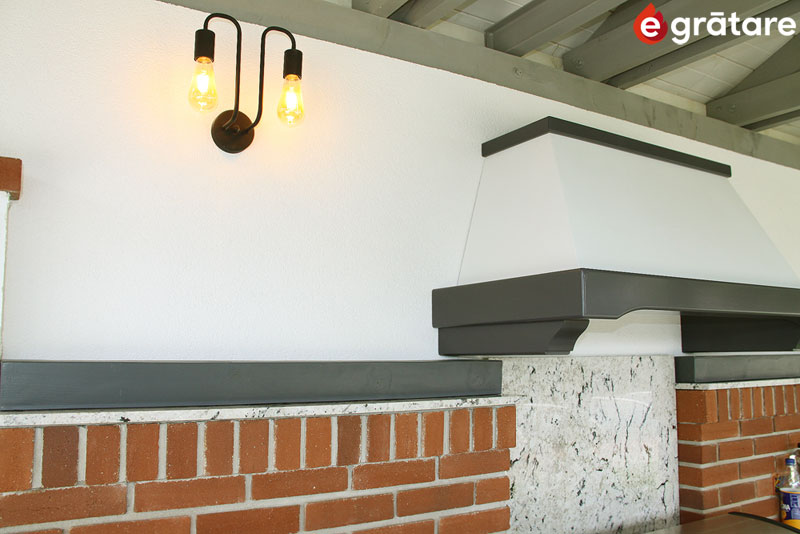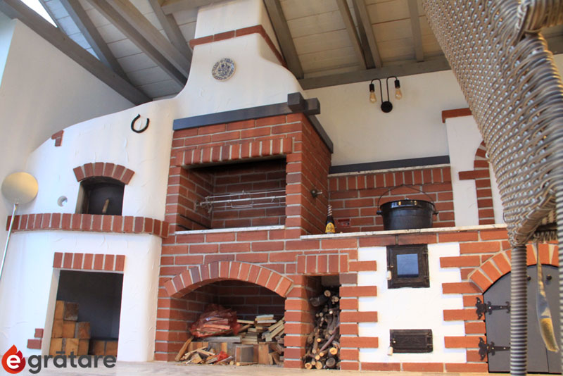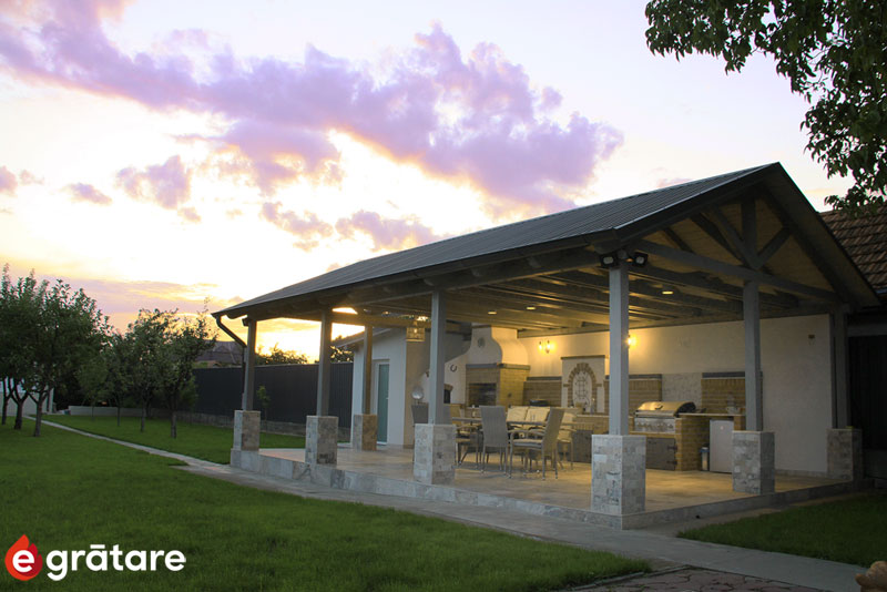 Gratar de gradina, Bucatarie de vara amenajata pe o terasa exterioara spatioasa se imbina perfect cu paleta de alb si gri al spatiului exterior.Intreaga imagine ne face sa visam la nopti de vara impreuna cu prietenii, mancare proaspta de la gratar si multa stare de bine . Bucataria in aer liber este perfecta pentru familiile carora le place sa gateasca si pretuiesc timpul petrecut impreuna.Bucataria contine: cuptor pe lemne (dimensiuni vatra diametru 72 cm), gratar/rotisor actionat electric cu sarcina de 40 kg, grill inox reglabil (dimensiuni 85x50cm) ,masa de lucru ,soba/plita fonta trei ochiuri standard, spatiu o grill pe gaz incorpotat , spatiu chiuveta cu usi lemn personalizate, masa de lucru pentru plita si chiuveta,spatiu plita pe gaz cu doua ochuri,spatiu frigider minibar, accesorii decor.