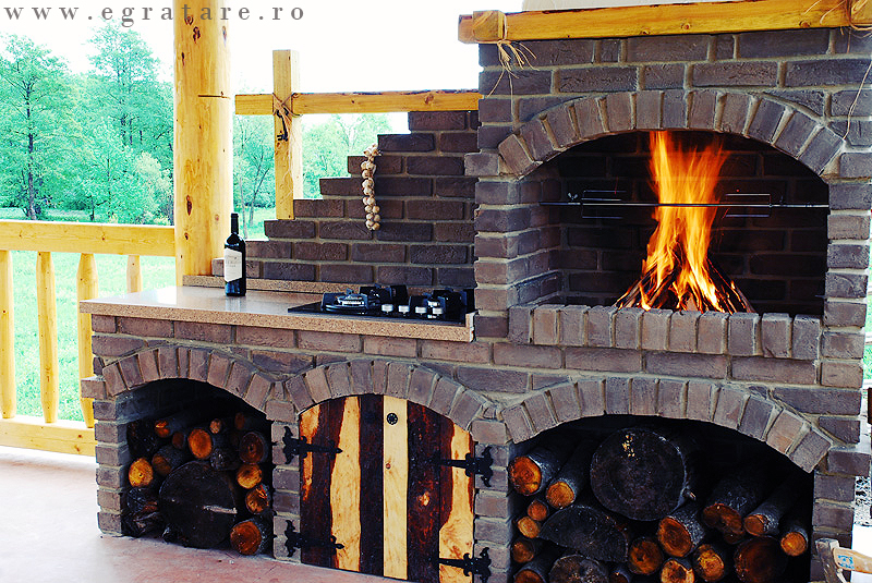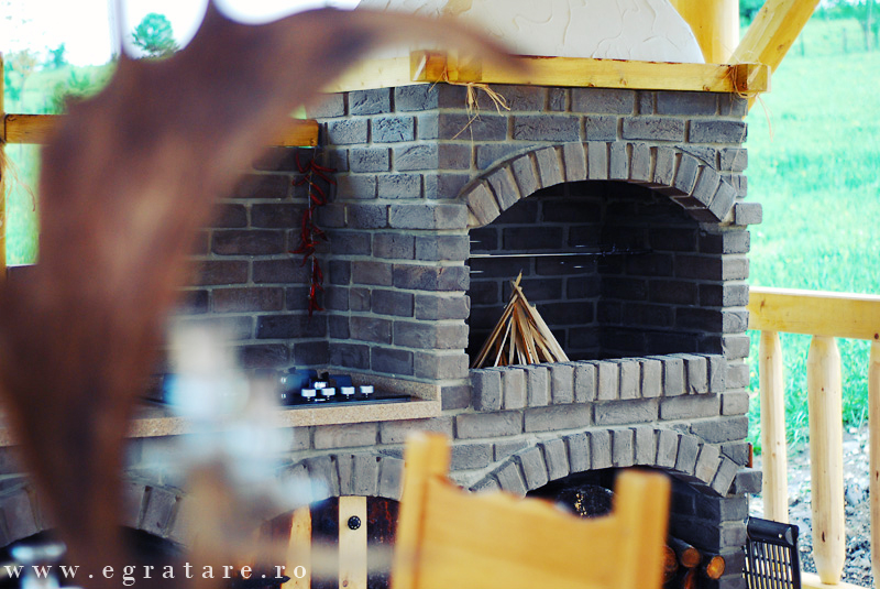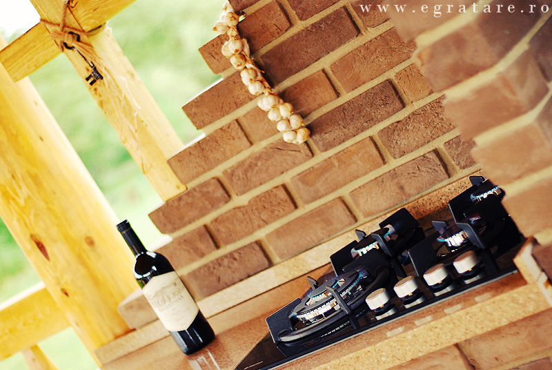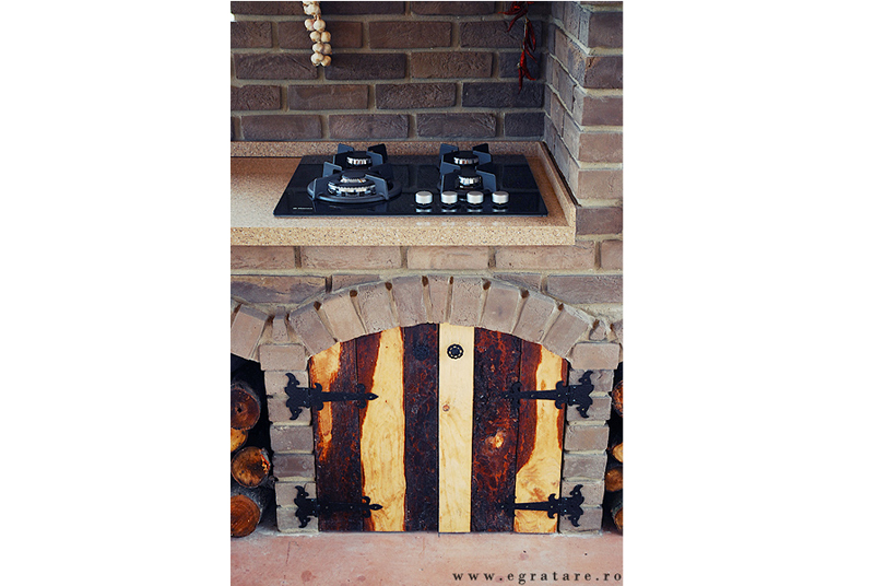 Bucatarie de vara cu spirit de aventura, gratar vanatoresc decorat discret cu multe detalii rustice, specificul acestuia este creat, insa, de blanurile si trofeele vanatoresti, care se gasesc din abundenta si in exterior, precum si lemnul, caramizile antichizate cu texturi proeminente.Gratar compus din trei module : masa de lucru cu blat granit (4 cm),plita gaz cu patru arzatoare si aprindere electrica,usi din lemn cu scoarta copac in ton cu balamalele din fier forjat, gratar multifunctional (85×50) , grill din inox cu picurator,rotisor electric inox, tamplarie lemn si ornament fier forjat