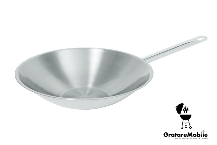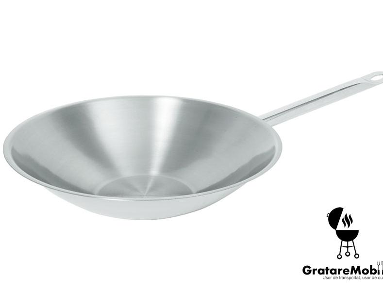 Wok inox, trei straturi, produs profesional horeca, import Olanda. Constructie de 3 straturi: aluminiu (1,5 mm), un strat exterior de otel cromat 18/0 (0,5 mm) si un strat interior din otel 18/8 (0,4 mm).
